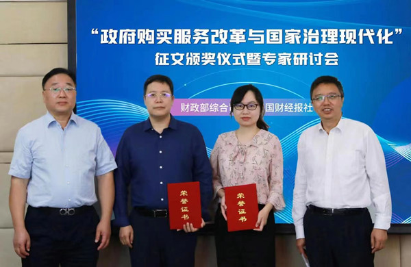 2022年9月20日,財(cái)政部綜合司(票據(jù)中心)聯(lián)合中國(guó)財(cái)經(jīng)報(bào)社在京舉辦“政府購(gòu)買(mǎi)服務(wù)改革與國(guó)家治理現(xiàn)代化”征文頒獎(jiǎng)儀式暨專(zhuān)家研討會(huì)。綜合司(票據(jù)中心)二級(jí)巡視員吳東勝、中國(guó)財(cái)經(jīng)報(bào)社社長(zhǎng)萬(wàn)平出席儀式,并為獲獎(jiǎng)代表頒發(fā)獲獎(jiǎng)證書(shū)。