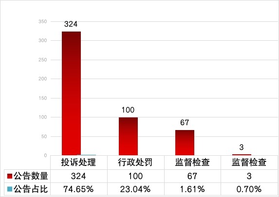 行政處罰結果公告100則,占23.04%。其中,在投訴處理中發現問題67,因監督檢查、舉報等發現問題33。