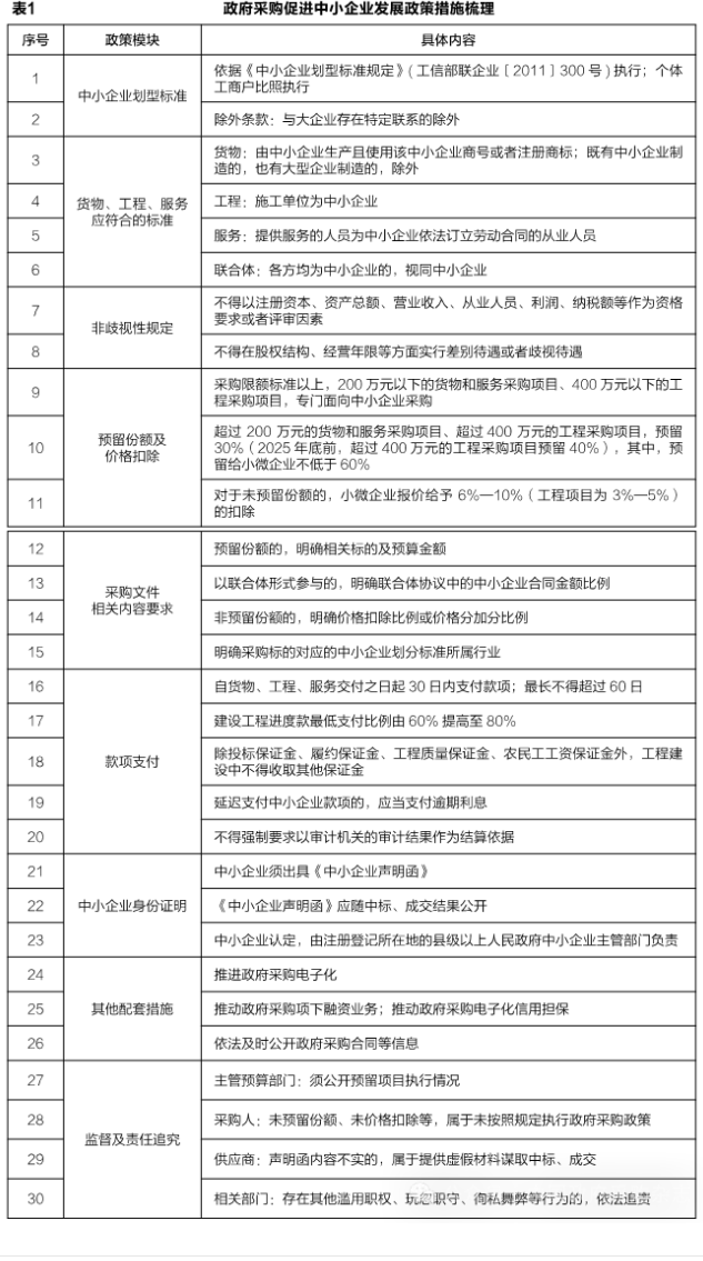 當(dāng)前,我國明確運(yùn)用政府采購工具支持中小企業(yè)發(fā)展的法律是《中華人民共和國中小企業(yè)促進(jìn)法》。在該法第六章第四十條中,具體規(guī)定了政府采購領(lǐng)域扶持中小企業(yè)發(fā)展的各項(xiàng)措施。根據(jù)該法和《中華人民共和國政府采購法》(以下簡稱《政府采購法》)等法律法規(guī),國家有關(guān)部門制定了《政府采購促進(jìn)中小企業(yè)發(fā)展管理辦法》(以下簡稱《管理辦法》)?!豆芾磙k法》從2021年1月1日起開始施行,是目前最直接的、相對全面的政府采購扶持中小企業(yè)文件。在《管理辦法》施行的前后,國務(wù)院以及國家有關(guān)部門還先后出臺了《關(guān)于促進(jìn)中小企業(yè)健康發(fā)展的指導(dǎo)意見》《保障中小企業(yè)款項(xiàng)支付條例》《關(guān)于加強(qiáng)財(cái)稅支持政策落實(shí) 促進(jìn)中小企業(yè)高質(zhì)量發(fā)展的通知》等一系列法規(guī)和規(guī)范性文件,其中均涉及中小企業(yè)參與政府采購的內(nèi)容。上述政策文件共同構(gòu)成了我國現(xiàn)行的政府采購扶持中小企業(yè)政策體系,其要點(diǎn)歸納見表1。