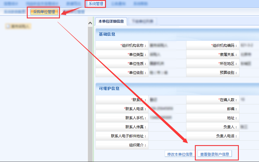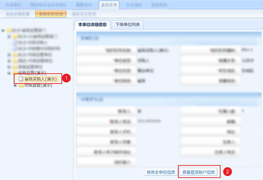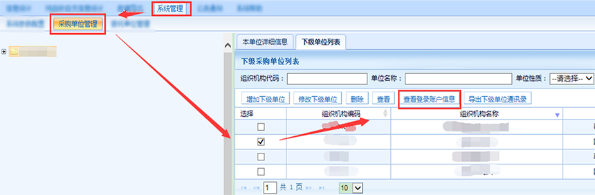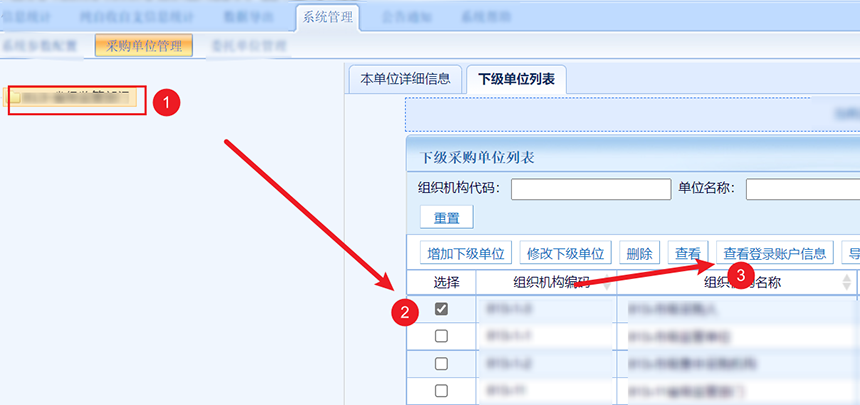 方法一,在左側(cè)組織樹(shù)找到下級(jí)單位并選中,然后點(diǎn)擊查看登錄賬戶信息。