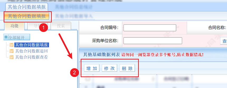 第二步,點(diǎn)擊其他合同數(shù)據(jù)填報(bào)進(jìn)行數(shù)據(jù)錄入,由于其他合同只在年末錄入,所以填報(bào)時(shí)不用選擇數(shù)據(jù)期間,錄入頁(yè)面類似普通合同(其他合同不用錄入合同編號(hào)與合同名稱)。