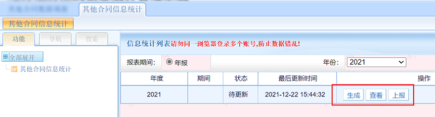 第三步,點(diǎn)擊其他合同信息統(tǒng)計(jì)生成報(bào)表(其他合同只有年報(bào),沒(méi)有季報(bào)),生成完成,檢查數(shù)據(jù)無(wú)誤后,點(diǎn)擊上報(bào)按鈕上報(bào)數(shù)據(jù)。