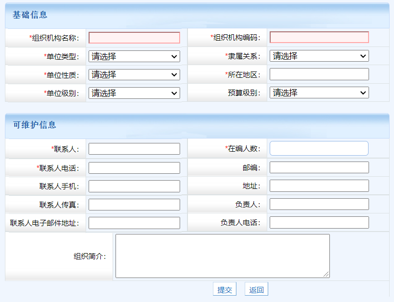 第二步,錄入下級(jí)單位信息,其中組織機(jī)構(gòu)編碼在系統(tǒng)中唯一,其中單位類型、單位性質(zhì)、單位級(jí)別影響系統(tǒng)功能和報(bào)表統(tǒng)計(jì),請(qǐng)謹(jǐn)慎選擇。