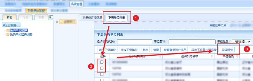 首先,在下級(jí)單位列表選擇要遷移的下級(jí)單位,然后點(diǎn)擊層級(jí)調(diào)整。