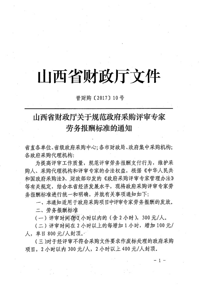 山西省財(cái)政廳關(guān)于規(guī)范政府采購(gòu)評(píng)審專家勞務(wù)報(bào)酬標(biāo)準(zhǔn)的通知